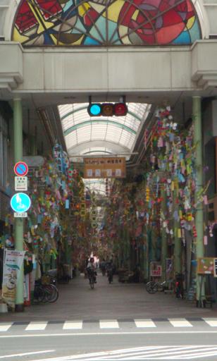 - 丸亀通町商店街は七夕用の笹が飾られ