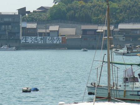まずこの地を訪れてみると、漁港に「生活権優先」と大きな文字で痛々しく